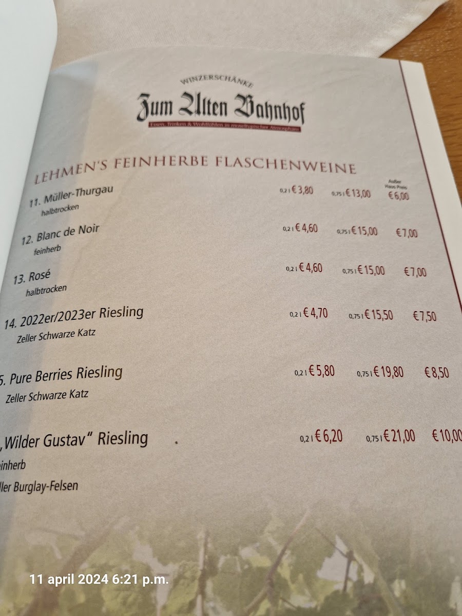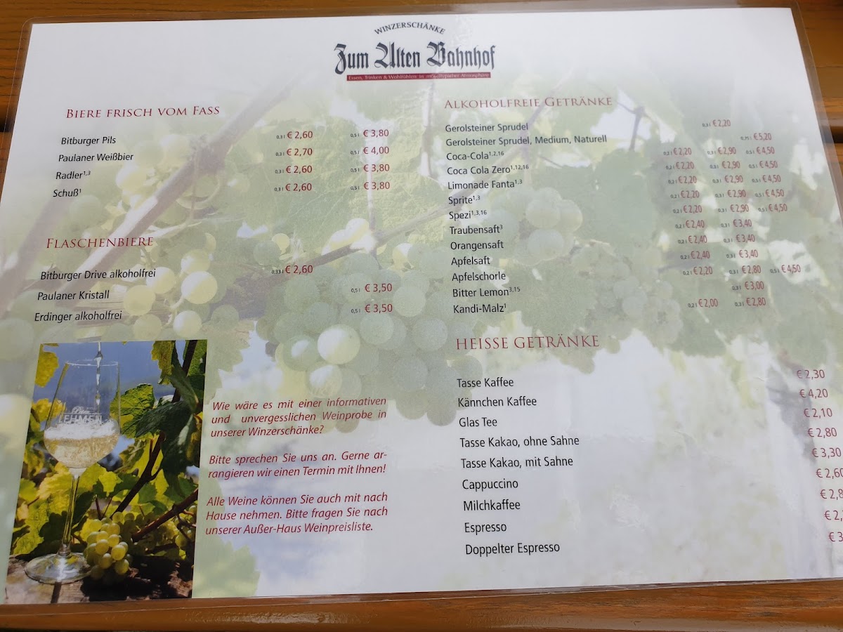 Outdoor seating allows guests to soak in the beautiful surroundings under a large umbrella, making it an ideal spot to unwind, whether it’s sunny or drizzly. With attentive service and a cozy atmosphere reminiscent of a station waiting room, Zum alten Bahnhof truly captures the heart of Mosel dining.